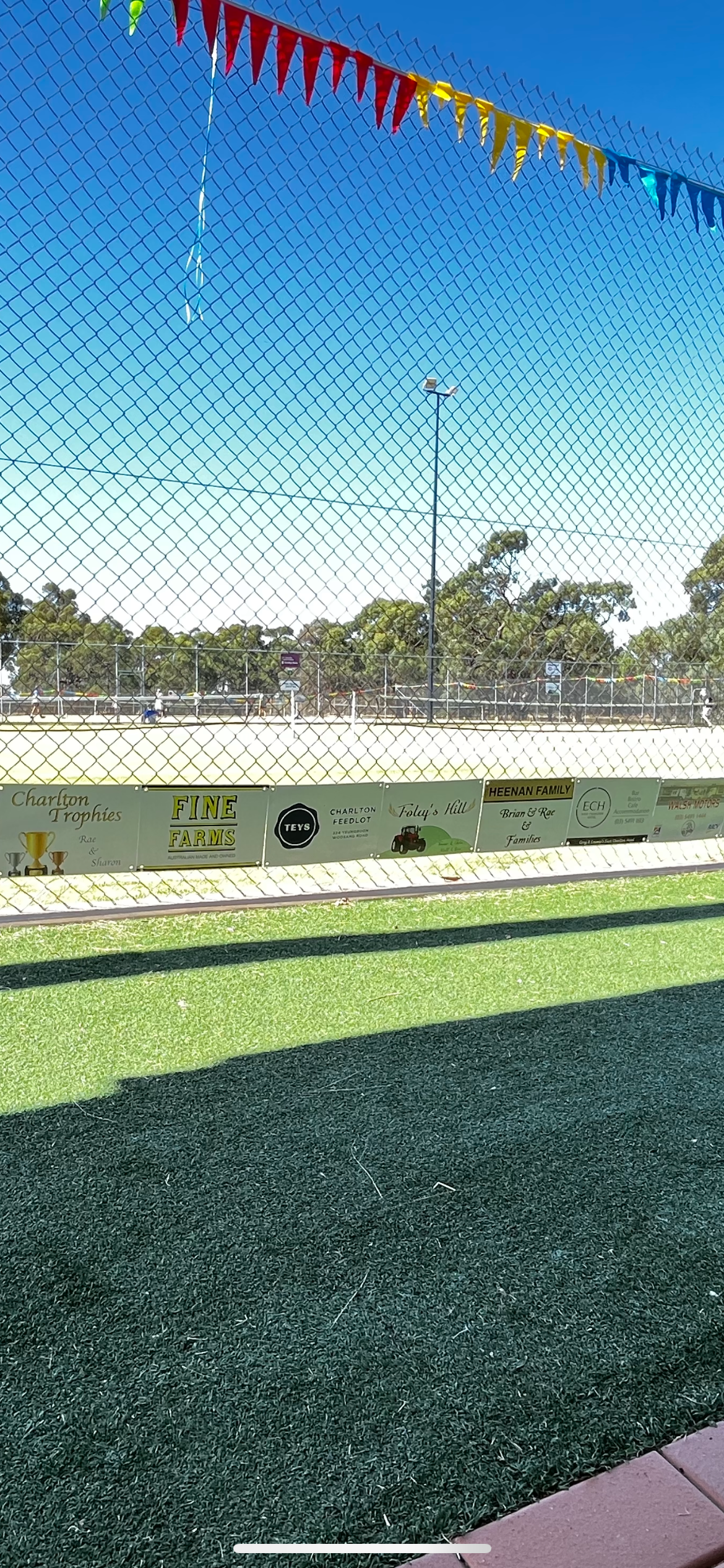 Charlton & District Community Bank sponsorship signs for Charlton Harness Racing Club at Charlton Park